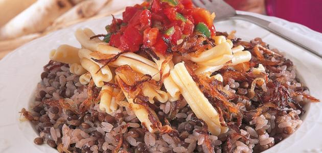 • إضافة صلصلة الكشري كطبقة على الكشري.