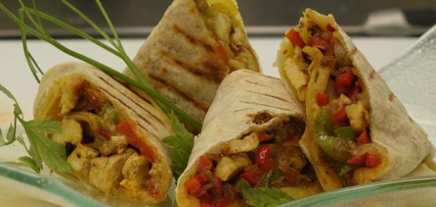 - نضع القليل من الدجاج في الرغيف، ثمّ نلفّه على شكل أسطوانة.