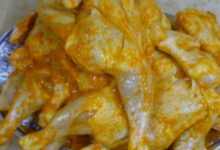 - اسلقي الدجاج مع إضافة مكعب مرقة الدّجاج، وينزع عنه الجلد والعظم ويقطّع إلى قطع متوسّطة.