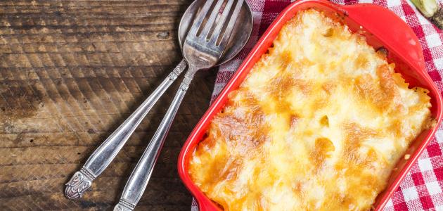 رص لحم البتلو، والبصل في طبق صالح للفرن وصب صلصة البشاميل فوقها ورشّ الكمية المتبقية من الجبن على الوجه.