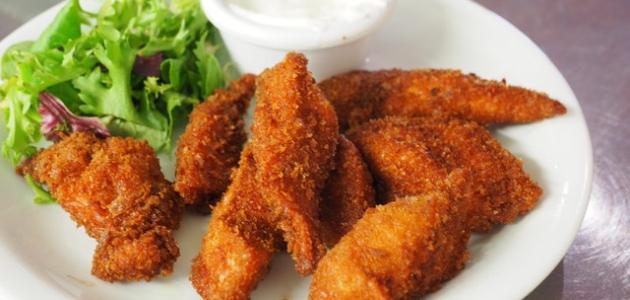 - إلقاءُ قطعِ الدَّجاج في الزَّيتِ بلطْفٍ، وقليُها حتّى تصبحَ ذهبيّةً مائلةً إلى البنيَّ وتنضجَ كليّاً.