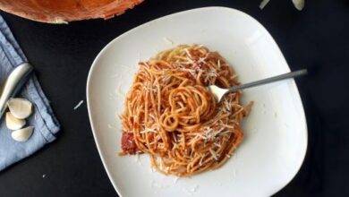- إضافة السباغيتي إلى القدر وتقليبها مع الصلصة ثمّ إضافة الجبنة الرومي وتقليبها جيداً.