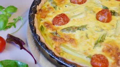 • يوضع البشاميل فوق الحشوة والجبن، وبعد ذلك توضع الصينية في الفرن مدّة نصف ساعة حتّى يتحمر الوجه.
