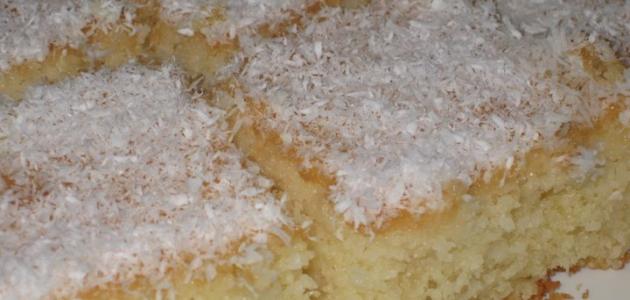 - نخرج الصينية من الفرن، ونقطعها إلى مربعات متوسطة، ثمّ نرشها بالقليل من جوز الهند، ونسكب عليها القطر البارد.