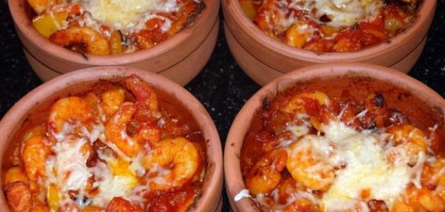 - نضع نصف كميّة الخضار، في الطاجن ثمّ الجمبري والسبيط، وفوقها طبقة أخرى من الخضار.