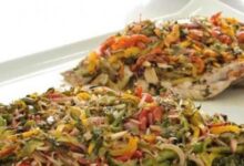 - نضع نصف كميّة الخضار، في الطاجن ثمّ الجمبري والسبيط، وفوقها طبقة أخرى من الخضار.