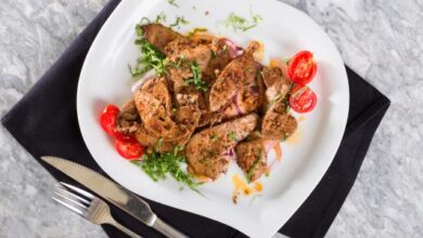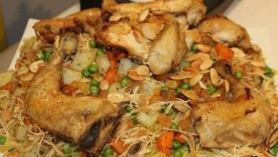• نضع قطع الدجاج جانباً في طبق مناسب للتقديم مع سكب القليل من المرق عليها حتى تبقى فاترة.