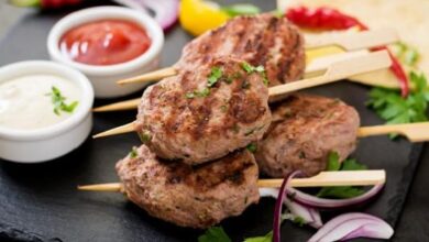 • سكب السوائل على شرائح اللحمة، وتقديمها بجانب الأرز الأبيض، واللبن والسلطة.