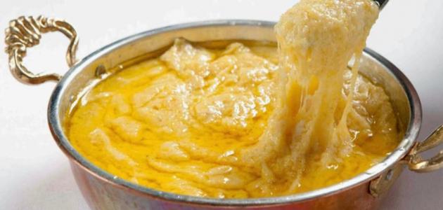 - ارفعي الإناء عن النار، واسكبيه في طبق التقديم، ثم شكّلي تجويفاً في منتصف العصيدة، وضعي فيها العسل والسمنة، وقدّميها ساخنةً.