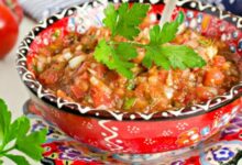 - نخلط مكوّنات الصلصة جيداً في وعاء صغير، ثمّ نسكبها على وجه الطبق.