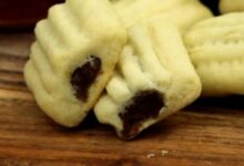 • اضغطي العجينة الأسطوانية بقالب المقروض المخصص لهذا الغرض، وقطعي العجينة باستخدام السكين الحادة إلى قطع متساوية الحجم على شكل المعينات أو المربعات، ثمّ ضعي قطع الغريبة في صينية الفرن المدهونة بالقليل من الزبدة والمرشوشة بالطحين.