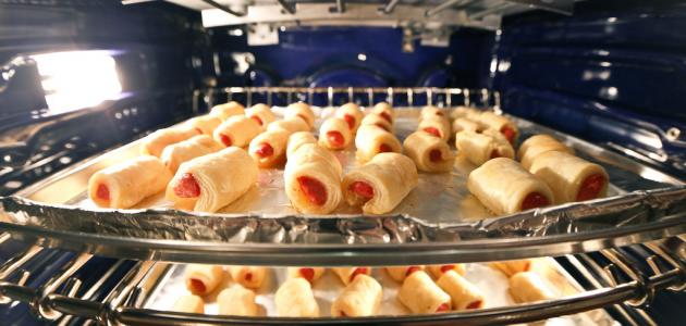 • نضع لفائف النقانق على صينية الخبز ونُدْخلها إلى الفرن مدة ثلاث عشرة دقيقة حتى تصبح ذهبية اللون.