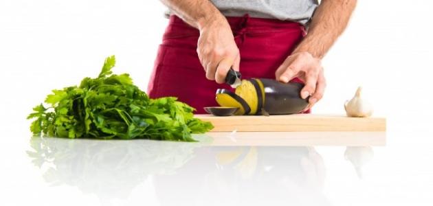 غسل الباذنجان وتقطيعه إلى خمس قطع مع المحافظة على شكل حبة الباذنجان.