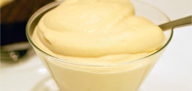 - تنقل الكريمة الجاهزة إلى وعاء زجاجي، وتغطى بالنايلون حتى تبرد، مع الحرص على أن يلامس النايلون سطح الكريمة، وذلك حتى لا تجف.