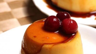 • بعد ذلك نقوم بتزيين الكريم كراميل حسب الذوق و اقترح هنا ان نضع على وجه القليل من العسل او مربى الفراولة ،و نضع على اطرافه الفواكه اما فراولة او موز .