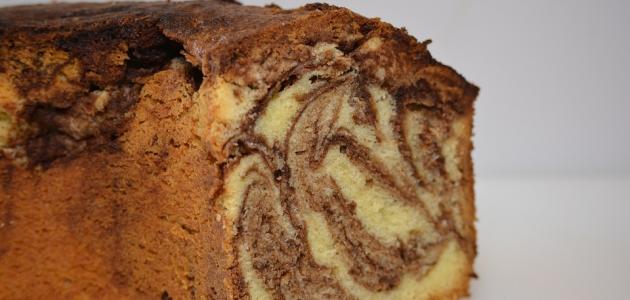 • إضافة بودرة الكاكاو على باقي الخليط والتقليب بالسباتيولا حتى اختفاء الكاكاو، وتوزيع الخليط على الخليط الأبيض بالقالب.