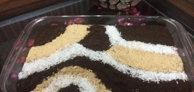 • زيّني الوجه بالبسكويت العادي، وبسكويت الشوكولاتة المطحون، والفستق الحلبي المطحون، وجوز الهند بالترتيب، وعلى شكل خطوط عريضة للحصول على شكل سجادة، ضعيها في الثلاجة مدة ساعة حتى تتماسك، وبعد ذلك قدّميها.