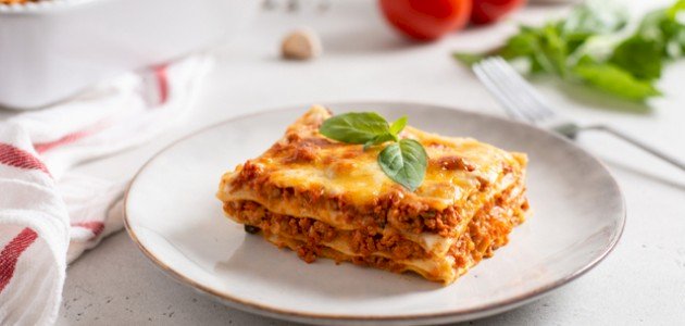 10. يُقدم طبق اللازانيا بصوص البولونيز مع خبز محمص بالثوم والجبن.