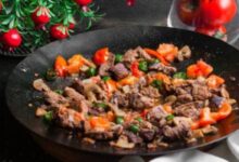 • في صحن التقديم نضع شرائح لسان العجل والبطاطا.