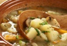 • نسكب الماء الناتج عن لسان العجل (المرقة) فوق الدقيق.