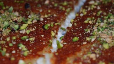 • اسكبي القطر البارد على الكنافة الساخنة، وزينيها بالفستق الحلبي المشجروش.
