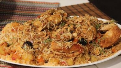• تقديم الأرز، ووضع اللحم من فوقه.