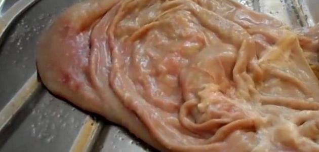 - اكشطي الكرشة من الداخل والخارج بالسكين، حتى تتخلصي من طبقة الدهون الملتصقة بها، ثم اغسليها بالماء.