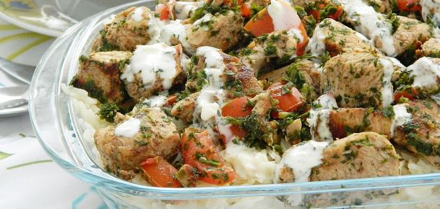 • نضع كمية مناسبة من الأرز فوق الخبز، بعد ذلك نضيف خليط الطحينية باللبن البارد، ويتم وضع قطع الدجاج فوق الخليط، ومن ثمّ نضع بعض الخبز المحمص والمكسرات مثل الصنوبر المحمص والكاجو.