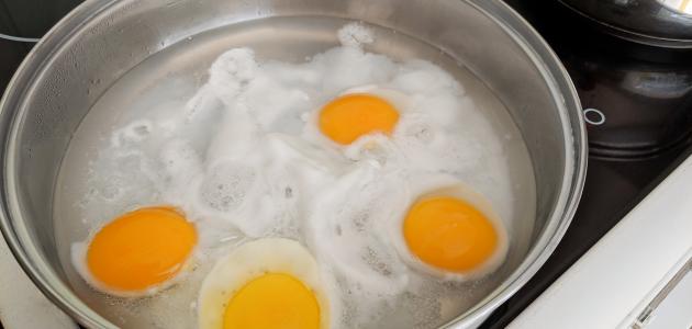 - تُكسر بيضة في وعاءٍ صغيرٍ ويُقلّب الماء، ثمّ تُضاف البيضة وتُترك قليلاً حتّى تنضج وترتفع لأعلى.
