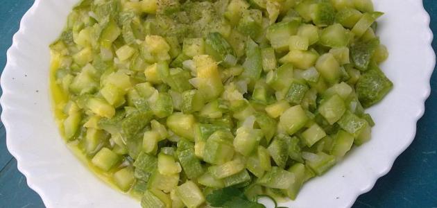 • نغسل الكوسا بالماء، من ثم نقوم بتقشيرها وتقطيعها إلى قطع صغيرة.