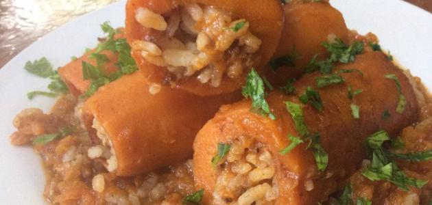- نحفر حبات الجزر، ونحشوها بخلطة الأرز، واللحم، ثمّ نرتب الجزر في قدر عميق للطهي.