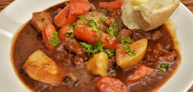 • وضع الخبز في طبق التقديم، وسكب الخضار والمرقة عليها.