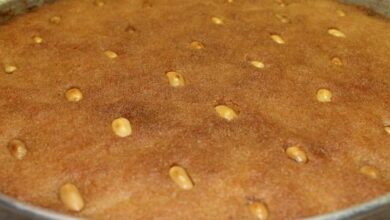- نشرّب البسبوسة الساخنة بالقطر البارد ونقطّعها لمربّعات صغيرة ونضعها في أوراق الكب كيك ونقدّمها باردة.