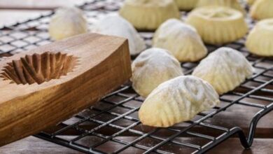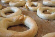 - نكّور العجينة على شكل دوائر متوسط الحجم، ونضعها في صينية مخصصة للفرن مع الحرص على ترك مسافة بين كرة وأخرى حتى لا تلتصق العجينة، ونضعها في فرن متوسط الحرارة لمدة عشرين دقيقة حتى تتحمر جيداً، ثم نخرجها من الفرن ونتركها حتى تبرد تماماً.
