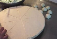 - وزعي الحشوة على قطع العجين، بحيث تأخذ كل قطعة مقدار ثلاث ملاعق كبيرة.