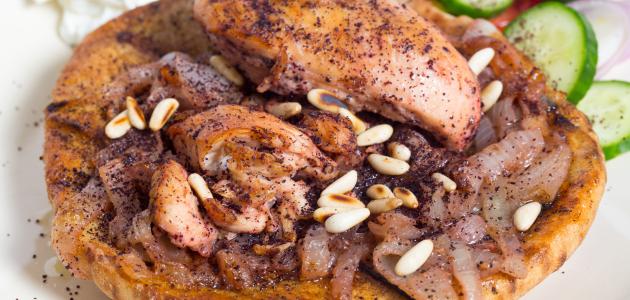 • تقطيع الدجاج إلى قطع صغيرة، وإضافته إلى البصل مع إضافة الصنوبر والكمية المتبقية من السماق.