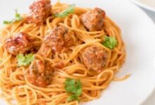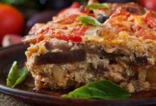 - نضع ثلثي كميّة المعكرونة في طبق الفرن المدهون بقليل من الزيت، ونوزّع خليط الحشوة فوقها.