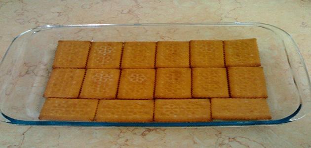 • سكب الخليط فوق بسكويت الشاي المرصوص في الصينية، وتوزيعه فوقه جيداً.