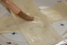 • نضع مقداراً من الزيت النباتي في مقلاة، ثم نرشّ مقداراً من طحين الدقيق عليها.