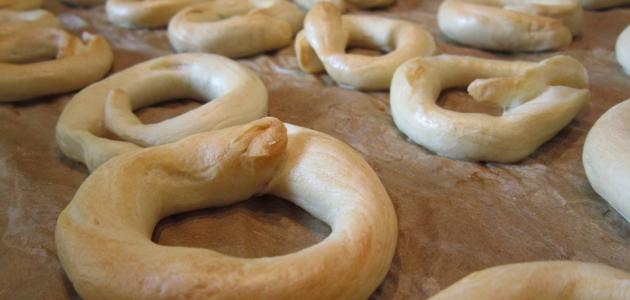 • أخذ قطعة من العجين بحجم حبة الجوز، ثمَّ تشكيله إلى إصبعٍ رفيع، ولفه وغلق الأطراف لتشكيل حلقة متوسطة الحجم.