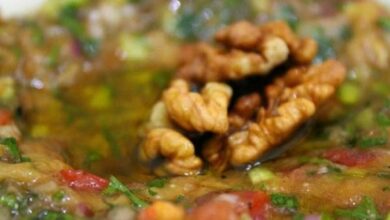 - تزيين الفتة من الأعلى بالقليل من مُخلل الخيار واللوز المُحمَّر وزيت الزيتون.