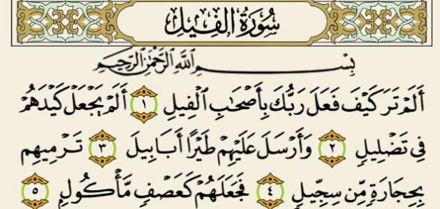 سورةُ الفيلِ سورةٌ مكيَّةٌ، وهي تتحدَّثُ عن قوم “أبرهة الأشرم” الذين توجَّهُوا إلى الكعبةِ لهدمِها، فأرسلَ اللهُ -تعالى- عليهم طيوراً تحملُ في مناقيرِها وأرجلِها حجارةً صغيرة، ولكنَّ هذهِ الحجارةِ الصغيرةِ أهلكَتهم عن بكرةِ أبيهم، وتُعتبرُ الطيورُ من المخلوقاتِ الضعيفةِ، وحدثت قِصَّةُ الفيلِ في عام خمسمئة وسبعين للميلاد في عام مولدِ النَّبيّ مُحمَّد -صلى الله عليه وسلم-، وكانت معجزة حقيقية،[١٣] وقد نزلت سورةُ الفيلِ بعد سورةِ الكافرونَ، والغرضِ الحقيقيُّ من هذه السورةِ هو ذكرُ قصَّةِ أصحابِ الفيلِ، لتكونَ عِبرة لكلِّ من يغترّ بقوَّتِه أو مالِه من قريش وغيرهم.[١٤] وهيَ خمسُ آياتٍ،[١٥] أما عن معاني السورة:[١٦]