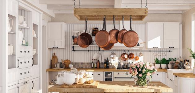 - تثبيت رف معلّق للأواني والمقالي مما يوفر مساحة إضافيّة والاستفادة من الفواصل لتسهيل إمكانيّة الوصول إلى أي شيء، إذ يستفاد من الفواصل الدائمة في ترتيب صواني الخبز وألواح التقطيع.[٥]