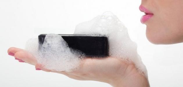 - تبليل اليدين بالقليل من الماء، وفرك صابونة الفحم في اليدين للحصول على الرغوة، حيث سيلاحظ وجود حبيبات ناعمة وصغيرة كالملح مع الرغوة.