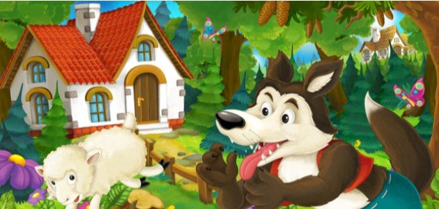 كان الذئب ينتظر بالفعل رحيل النعجة. وكان مغرمًا جدًا بلحم الخراف الصغيرة، وذهب إلى كوخ الخراف وطرق على الباب، وقال: “مرحباً يا أطفال: أنا هي أمكم. افتحوا الباب. لقد أحضرت لكم طعامًا جيدًا.” لكن كان الأطفال أذكياء، ولقد تعرفوا على صوت الذئب وقالوا: “أيها الذئب الشرير! لا تحاول أن تخدعنا ابتعد!”.