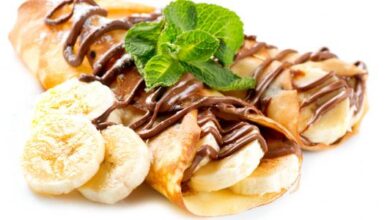 • دهن الكريب بالنوتيلا، وإضافة قطع الموز وشرائح الفراولة، ولف الكريب.