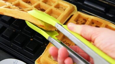 • أخذ كمية من العجينة باستخدام المغرفة، ووضعها في المقلاة وتقليبها ثلاث مرات.