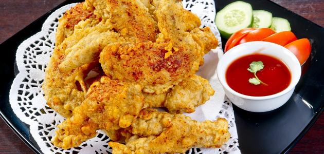 - وضع قطع الدجاج في الزيت الساخن حتى تتحمر، ثم تقليب القطع وتركها على نارٍ متوسطة لمدة ثماني دقائق، إلى تصبح ذهبية اللون.