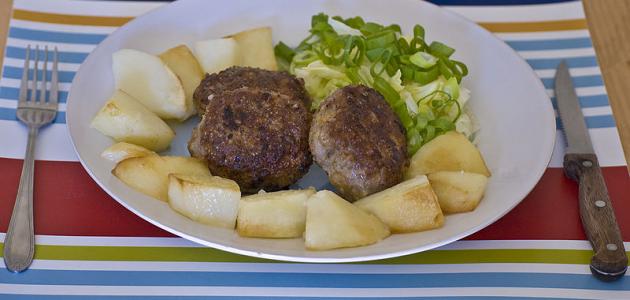 • وضع شريحة من البطاطا بشكل رأسي ثمّ قرص من الكفتة ثمّ شريحة من البطاطا ثمّ قرص من الكفتة، ورصها في الطبق على الخضروات بشكل رأسي.