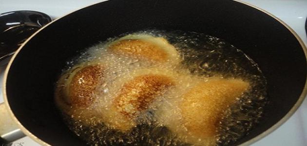 • يسخّن الزيت في مقلاة واسعة، وتُقلى حبات القطايف حتى تتحمّر.